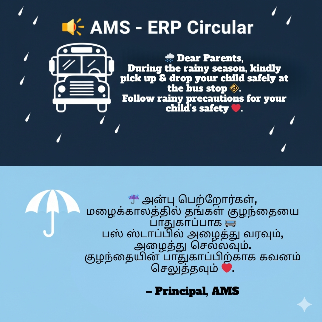 During the rainy season, kindly pick up & drop your child safely at the bus stop .