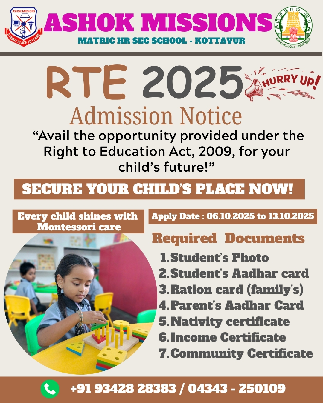 ???? RTE Admission Open Now! Ashok Missions School – Pre-KG to Std 1 ✅ Quality education | Free seats for eligible students ???? Contact: 80155 59917 Online Admission Link : https://admin.ashokmissionschool.com/online_admission